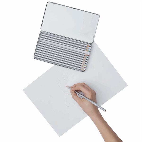 12 długich kredek SILVERSTAR pokrytych srebrnym lakierem, w prostokątnym, metalowym pudełku, naostrzone.