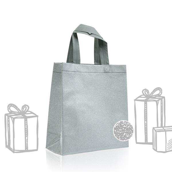 Błyszcząca torba na prezent non-woven 130g. Rozmiar: 26 x 23 x 10 cm TT2 (termotransfer): 15 x 10 cm Kolor: Srebrny