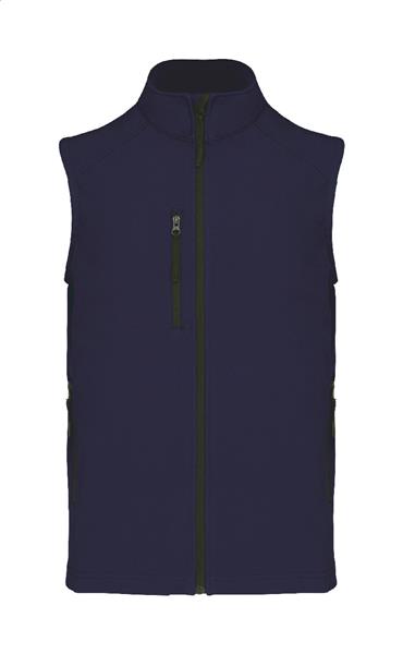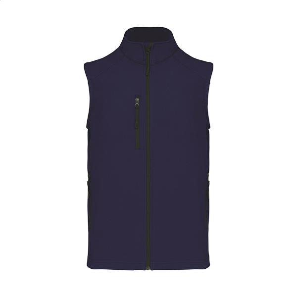 Trójwarstwowa, oddychająca, wiatroszczelna i wodoodporna kamizelka ocieplająca typu softshell z zamkiem błyskawicznym, z kieszeniami na piersi i bocznymi zapinanymi na zamek. Z oddychającą warstwą środkową i wewnętrzną warstwą z mikropolaru. 95% poliester i 5% elastan, 300 g/m2. Produkt marki Kariban.
