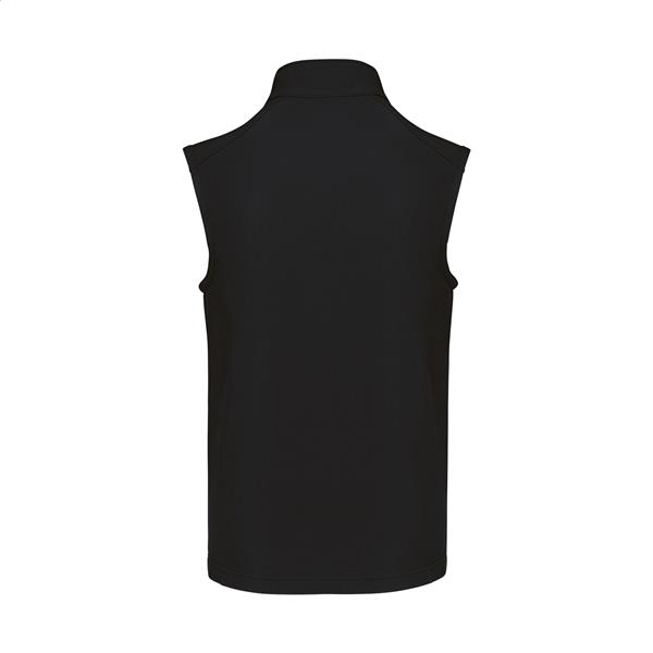 Trójwarstwowa, oddychająca, wiatroszczelna i wodoodporna kamizelka ocieplająca typu softshell z zamkiem błyskawicznym, z kieszeniami na piersi i bocznymi zapinanymi na zamek. Z oddychającą warstwą środkową i wewnętrzną warstwą z mikropolaru. 95% poliester i 5% elastan, 300 g/m2. Produkt marki Kariban.