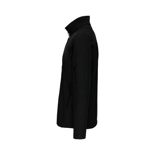Trójwarstwowa, oddychająca, wiatroszczelna i wodoodporna kurtka softshell zapinana na zamek, z rękawami i kieszeniami bocznymi zapinanymi na zamek. Z oddychającą warstwą środkową i wewnętrzną warstwą z mikropolaru. 95% poliester i 5% elastan, 300 g/m2. Produkt marki Kariban.
