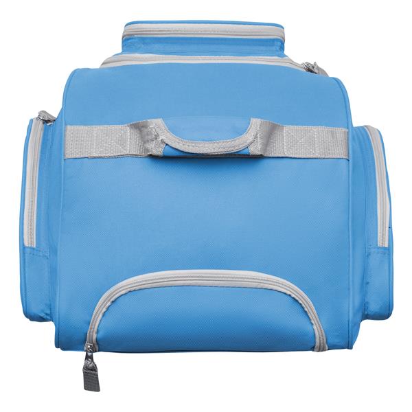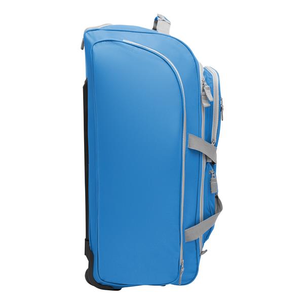 Torba podróżna na kółkach 9P. 3 przednie kieszenie na zamek, przestronna komora główna na zamek z 3 dodatkowymi kieszeniami na zamek, z tyłu 1 kieszeń na zamek, 1 wyściełany uchwyt do przenoszenia, wysuwana rączka do ciągnięcia torby ukryta w kieszonce na zamek, lekko jeżdżące kółka z ochraniaczami rogów, 2 płozy i stopki do podparcia o podłoże. Wiele kieszonek dla lepszej organizacji pakowania.