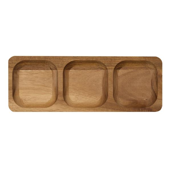 Taca do serwowania ACACIA SELECTION. Wykonana jest z olejowanego drewna akacjowego. Posiada 3 wygodne przegrody, np. na orzechy czy słodycze.