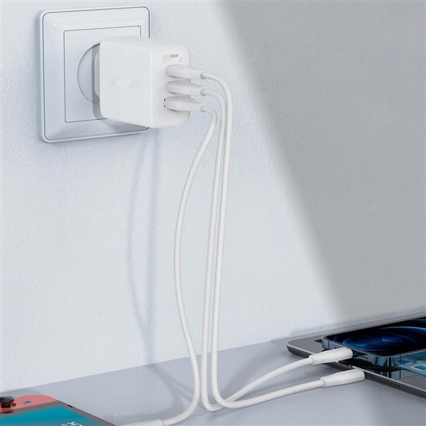 Szybka ładowarka sieciowa marki Acefast. Posiada 2 porty USB Typ C i USB. Kiedy do ładowarki podłączone jest tylko 1 urządzenie, pierwsza wtyczka USB Typ C oznaczona jako „C1” umożliwia ładowanie z maksymalną mocą 65W, wtyczka „C2” z mocą do 20W, a wtyczka USB do 18W. Za pomocą portu „C1” można zasilać notebooki, które do pracy wymagają mocy o wartości do 65W (sprawdź specyfikację swojego komputera). Pozwala na szybkie ładowanie trzech urządzeń jednocześnie m.in. w standardach PPS, Power Delivery, Quick Charge 3.0, AFC i FCP. Jest wykonana z ognioodpornego materiału PC. Została wyposażona w wiele zabezpieczeń takich jak np. przed przegrzaniem, przepięciem, wysokim napięciem czy przeciążeniem. W zestawie z ładowarką znajduje się kabel USB Typ C – USB Typ C.