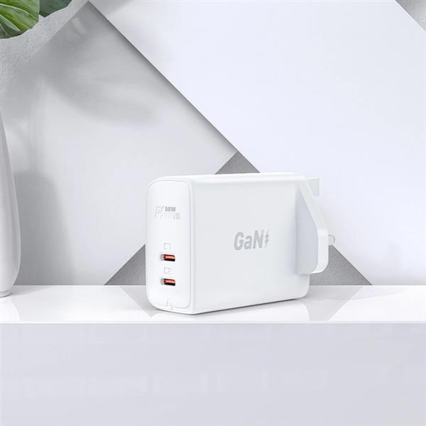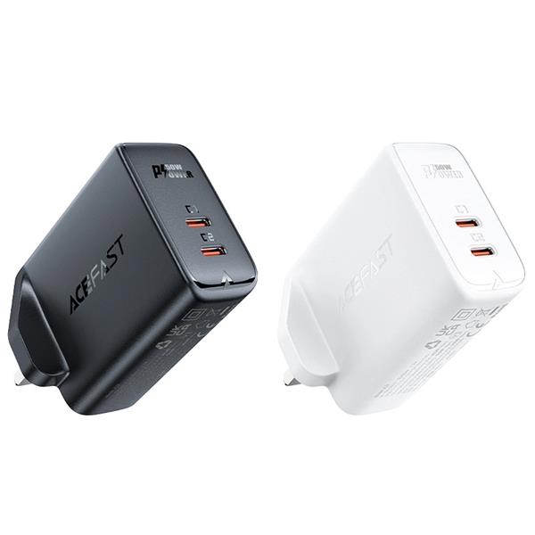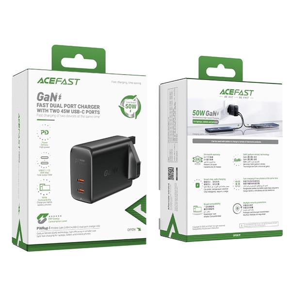 Szybka ładowarka sieciowa marki Acefast. Przeznaczona na rynek brytyjski, pasuje do gniazd typu UK. Posiada dwa porty USB Typ C, które umożliwiają ładowanie z mocą do 50W. Pozwala na szybkie ładowanie urządzeń m.in. w standardach PPS, Power Delivery, Quick Charge 3.0, AFC i FCP. Jest wykonana z ognioodpornego materiału PC. Została wyposażona w wiele zabezpieczeń takich jak np. przed przegrzaniem, przepięciem, wysokim napięciem czy przeciążeniem. Elektroniczne komponenty ładowarki zostały wykonane w technologii GaN czyli są oparte na azotku galu, a nie na krzemie. GaN to lepsza efektywność pracy i mniejsze zużycie energii.