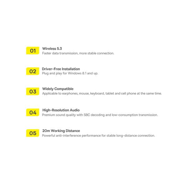 Kompaktowy adapter USB Bluetooth 5.3. To miniaturowe urządzenie rozszerza funkcjonalność laptopa lub komputera stacjonarnego o bezprzewodową łączność Bluetooth. Pozwala połączyć z komputerem wiele urządzeń peryferyjnych takich jak bezprzewodowe myszy i klawiatury, głośniki i słuchawki Bluetooth, pady do gier i telefony do łatwego przesyłania danych. Z jego pomocą można podłączyć do kilku urządzeń jednocześnie. Zasięg działania takiego urządzenia wynosi do 20m. Do poprawnego działania urządzenia wymagana jest instalacja sterowników.
