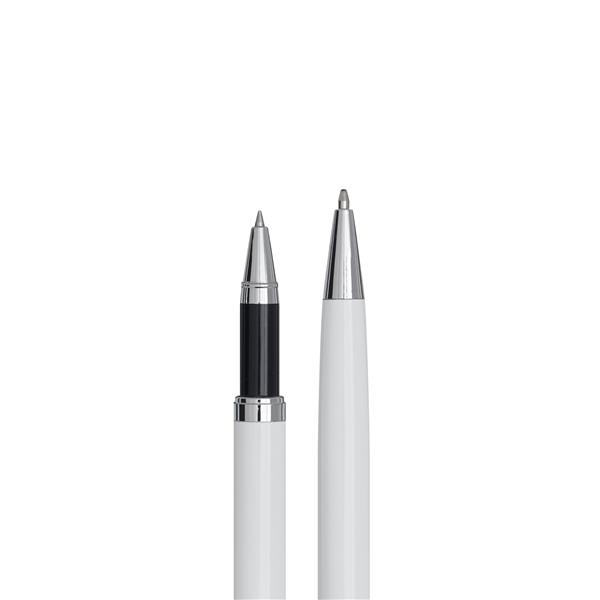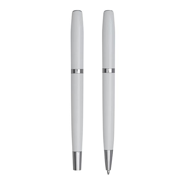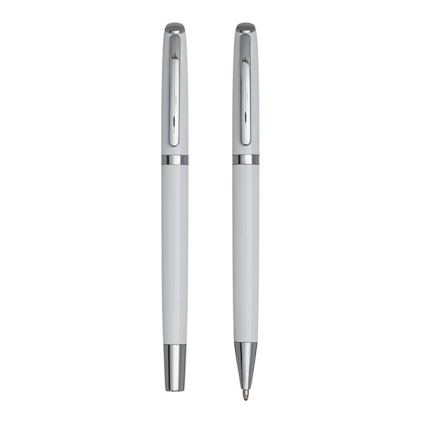 Zestaw do pisania ALPHABET składa się z długopisu z mechanizmem obrotowym i pióra kulkowego, czarny tusz, pakowany w pudełko. Materiał: Aluminium Kolor: biały Tagi: Długopisy,długopisy,akcesoria biurowe,przybory do pisania,zestawy piśmienne