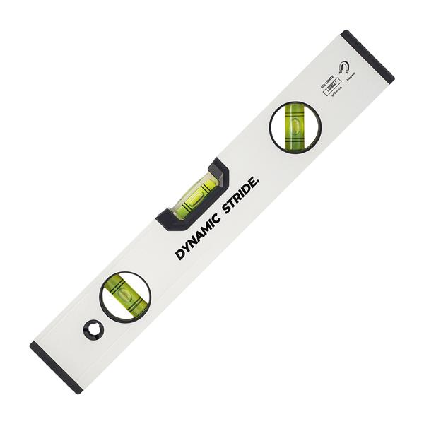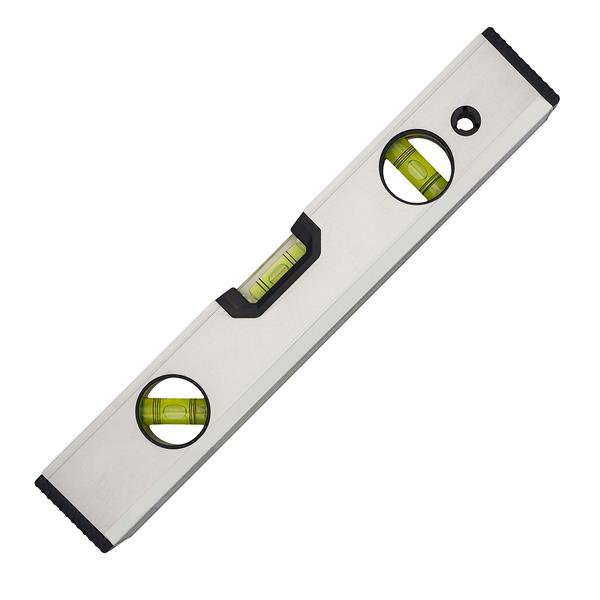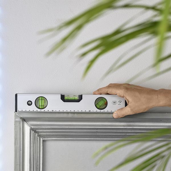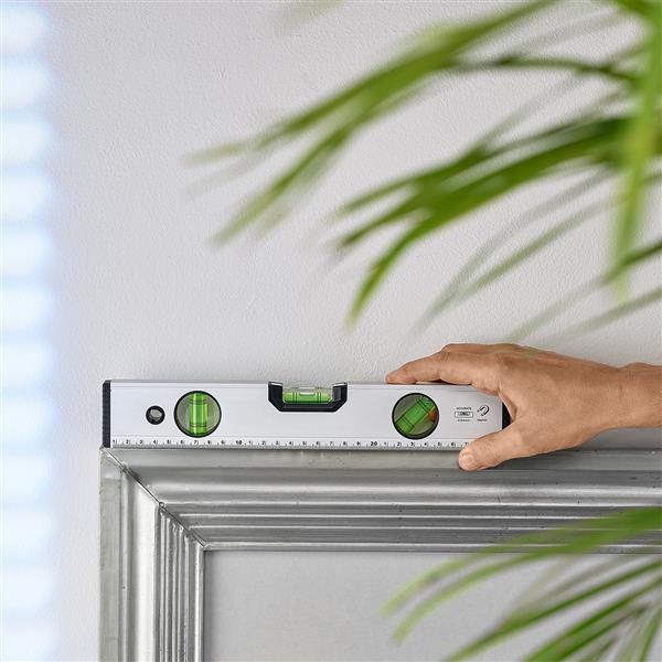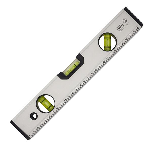Aluminiowa poziomica o długości 30 cm wyposażona w magnetyczną podstawę oraz 3 libelle pomiarowe: 0°, 90° i 45°.