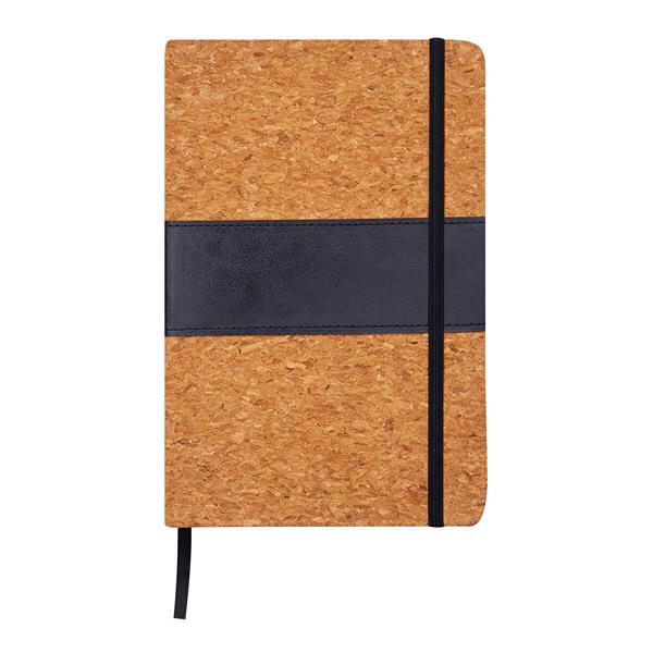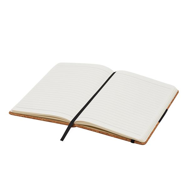 Notatnik AMBIENCE w formacie A5. Z zaokrąglonymi rogami, ze zintegrowaną zakładką i gumką do zamykania. Papier 70 g/m2, 90 kartek w linie. Korkowa oprawa z ozdobnym paskiem PU.