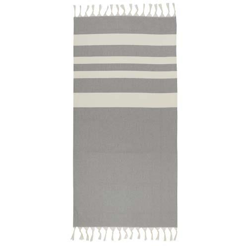 Ręcznik hammmam Anders zapewniający luksusowy komfort dzięki dużym wymiarom (147 x 75,5 cm) oraz dużą osłonę, niezależnie od tego, czy wylegujesz się przy basenie, czy spędzasz dzień na plaży.. Ręcznik ma eleganckie frędzle na obu końcach i jest wykonany z 30% bawełny, 35% bawełny z recyklingu z certyfikatem GRS i 35% poliestru z recyklingu z certyfikatem GRS, 180 g/m2.