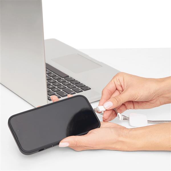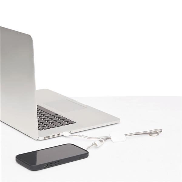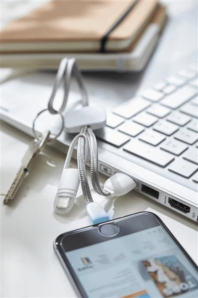 Kabel ładujący ANNOUNCER, z 2 złączami do ładowania urządzeń elektronicznych i smartfonów. Długość ok. 50 cm, z brelokiem na klucze. Wskaźnik zasilania LED zmienia kolor z czerwonego na niebieski po zakończeniu procesu ładowania lub gdy moc ładowania jest niższa niż 0,3 A. Materiał: Plastik/Poliester/Metal Kolor: biały Tagi: Kable do ładowarek,Akcesoria do telefonów komórkowych/smartfonów,Akcesoria do tabletów