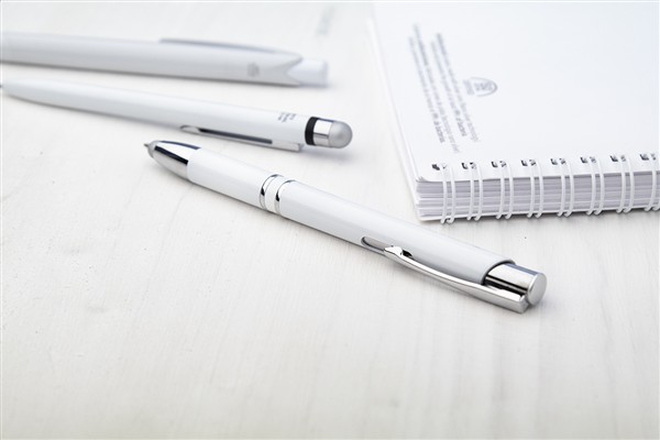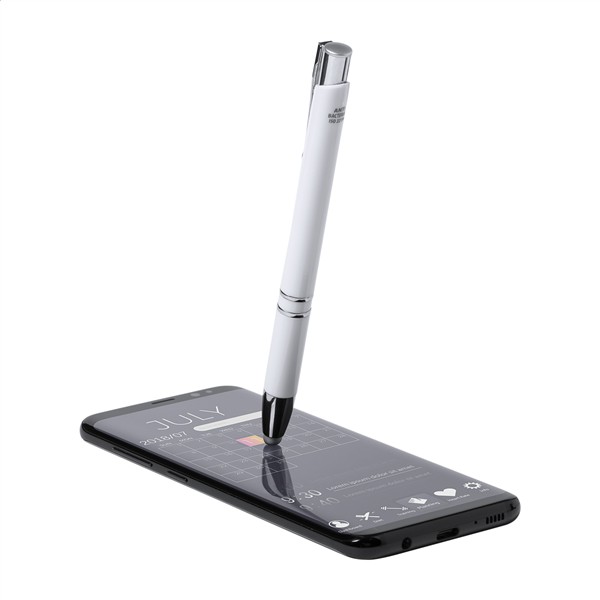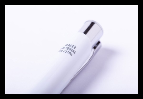 Antybakteryjny długopis z końcówką do ekranów dotykowych i niebieskim wkładem. Zgodny z ISO 22196.