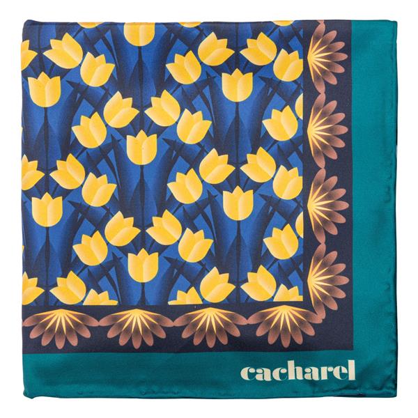 Apaszka Albane wykonana z wysokiej jakości poliestru w delikatny, jednak chrakterystyczny, kwiatowy wzór z pięknie wyeksponowanym logo Cacharel w centralnej części.