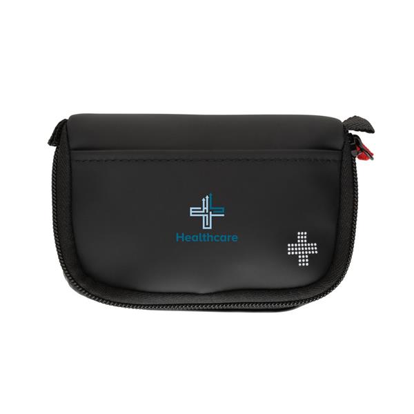 Apteczka 16 el., w pokrowcu z materiałów z recyklingu na zamek błyskawiczny, wewnątrz: bandaż trójkątny, bandaż PBT, waciki nasączone alkoholem 4 szt., wacik, plastry 5 szt., nożyczki, szpilki 2 szt., taśma, zapakowana apteczka mieści się w skrzynce pocztowej, spełnia wymagania normy EN ISO 13485:2016, 93/42/EWG i UE (2017/745), całkowita zawartość materiałów z recyklingu obliczona na podstawie wagi całkowitej produktu: 59%