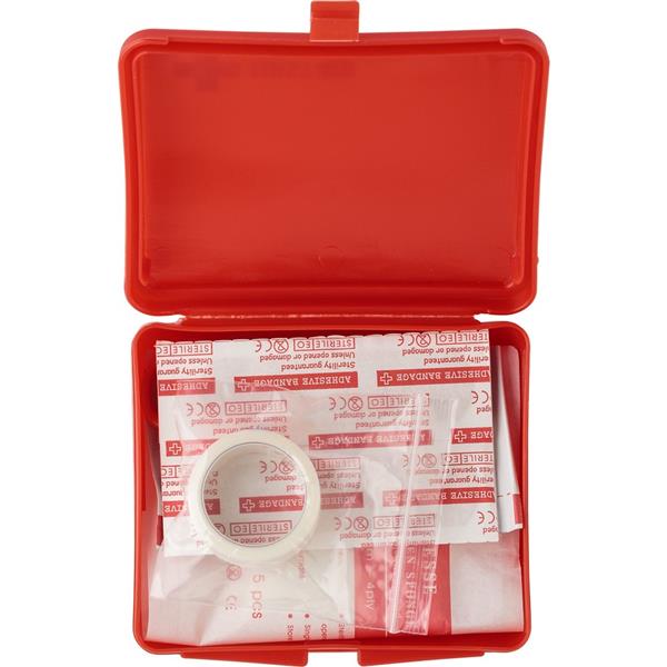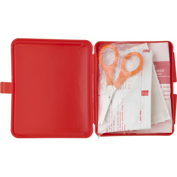 Apteczka w plastikowym opakowaniu, 10 el., w tym: 5 plastrów, 2 chusteczki nasączone alkoholem, rolkę taśmy, nożyczki oraz gąbka