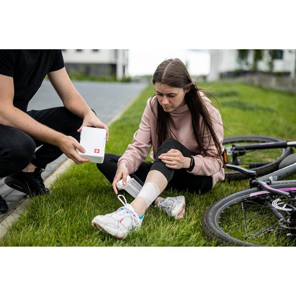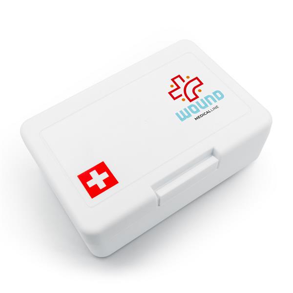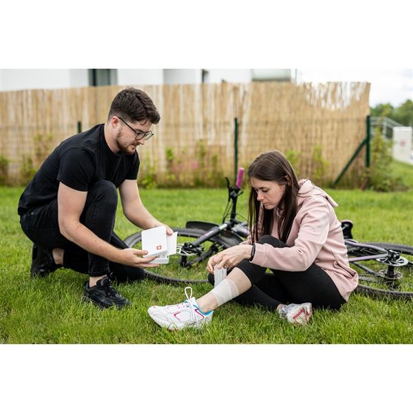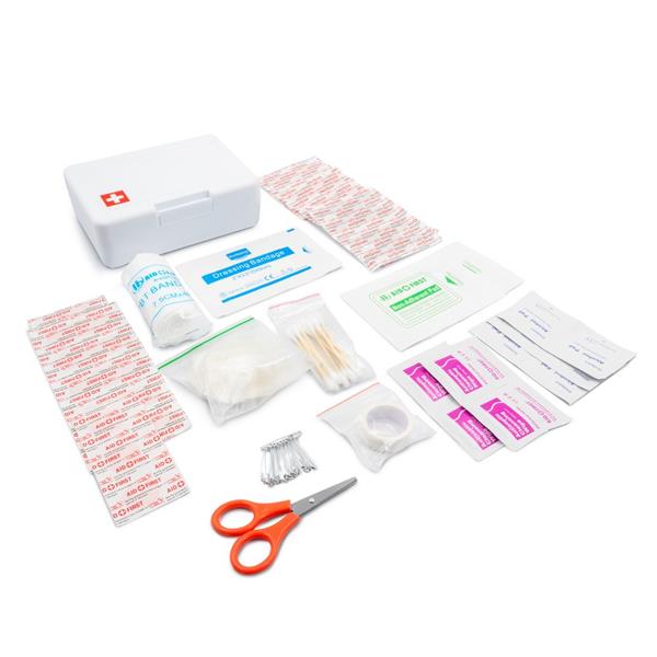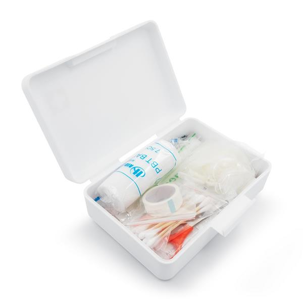 Apteczka w plastikowym opakowaniu, wewnątrz: plastry 72×19 mm (10 szt.), plastry 56×19 mm (5 szt.), plastry 40×10 mm (5 szt.), plastry O22 mm (5 szt.), plastry elastyczne 76×38 mm (2 szt.), płatki nasączone alkoholem 3×6 cm (6 szt.), opatrunki nieprzylegające 5×7,5 cm (2 szt.), taśma non-woven 1,25 cm x 4,5 m (1 szt.), bandaż elastyczny 7,5 cm x 4 m (1 szt.), nożyczki (1 szt.), chusteczki antyseptyczne 2×20 cm (4 szt.), patyczki kosmetyczne (10 szt./torebka), agrafki (10 szt.), rękawiczki jednorazowe (1 para), okład na ranę non-woven 5×9 cm (1 szt.)