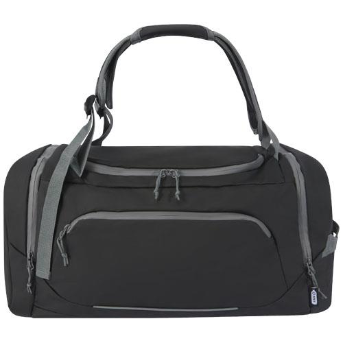 Wodoodporny plecak podróżny 2-w-1 wykonany z materiałów pochodzących z recyklingu z certyfikatem GPR, w tym zamków błyskawicznych. Posiada przestronną komorę główną z otworem w kształcie litery U ułatwiającym przechowywanie i dostęp, dwie boczne kieszenie zapinane na zamek (w tym przegrodę na buty), jedną przednią kieszeń zapinaną na zamek, siatkową kieszeń na wodę z tyłu oraz odblaskowe lamówki zapewniające widoczność. Tę torbę można nosić na 3 różne sposoby: W dłoni, przerzuconą przez ramię lub jako plecak z wyściełanymi i regulowanymi ramiączkami. Materiały z recyklingu GRS obejmują główny materiał, podszewkę, taśmy i zamki błyskawiczne. Pojemność: 35 litrów. Wolne od PVC.