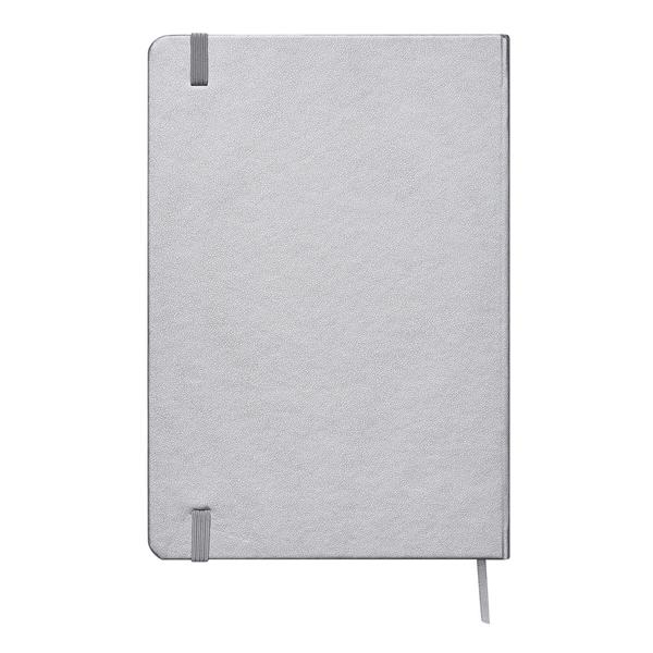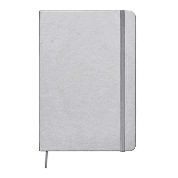 Notes ATTENDANT w formacie A5 z zaokrąglonymi rogami, zamykany gumką, z wszytymi zakładkami i dodatkową kieszenią z tyłu na notatki, 80 kartek w linie, gramatura ok. 80 g/m2. Materiał: Papier Kolor: srebrny Tagi: notebooki,akcesoria biurowe