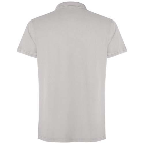 Koszulka polo unisex z krótkim rękawem Wykończenie uzyskane dzięki poddaniu działaniu wybielacza w celu uzyskania smug lub odbarwień. Dekolt i mankiety wykończone prążkowanym ściągaczem 1×1, z otworami po bokach. Ścieg kryty ton w ton. Zapięcie na trzy guziki.
