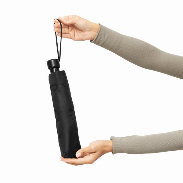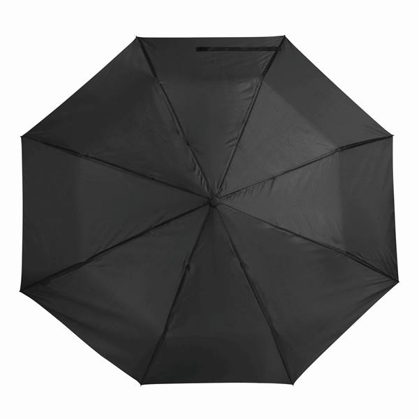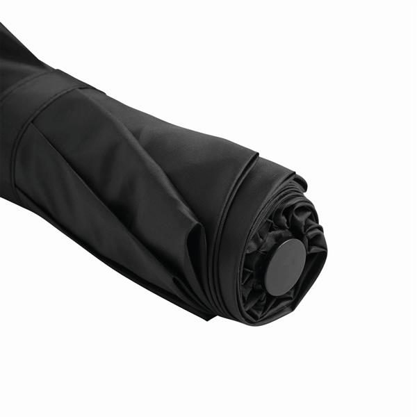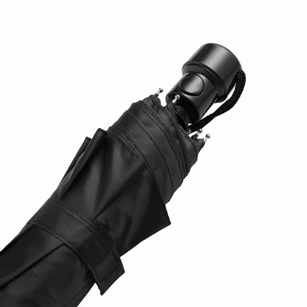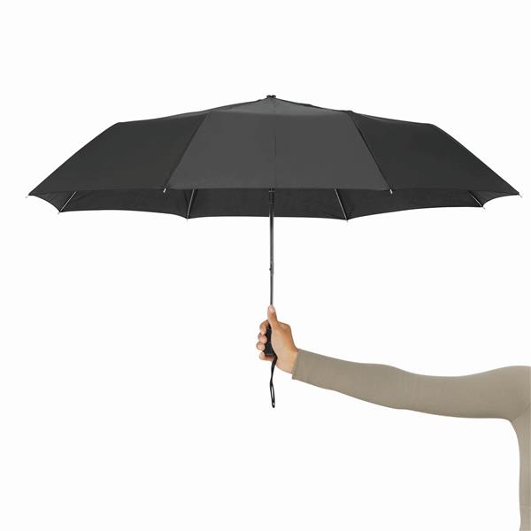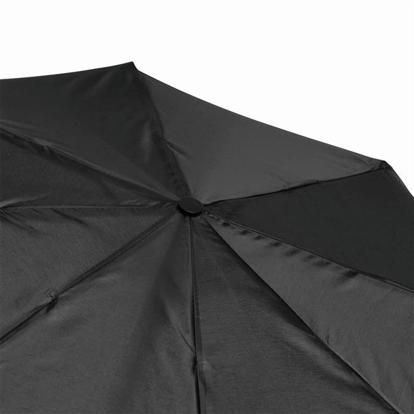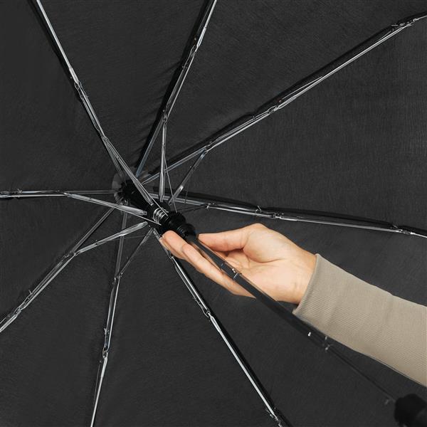 Automatyczny parasol kieszonkowy PRIMA. Pokrowiec w kolorze poszycia, 3-częściowa metalowa laska, szyny i kolce, czarny, plastikowy uchwyt z automatycznym przyciskiem i pętelką, poszycie z poliestru, zapinany na rzep. Materiał: Metal/Poliester Kolor: czarny Tagi: Parasole,parasole,akcesoria podróżne,parasole składane