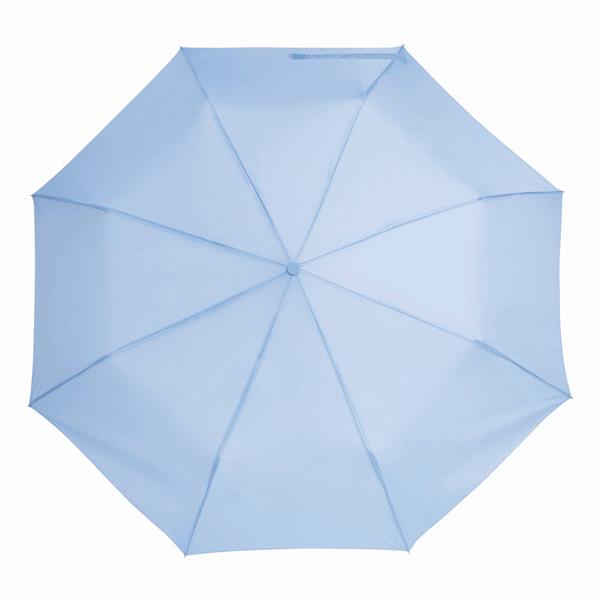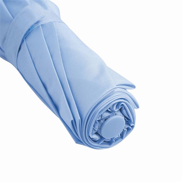 Automatyczny parasol mini COVER. Poszycie poliester-pongee, metalowe szyny, 3 x składana laska, uchwyt, przycisk i sznureczek w kolorze poszycia. Materiał: Metal/Poliester Kolor: błękitny Tagi: Parasole,parasole,akcesoria podróżne,parasole składane