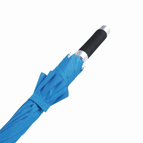 Automatyczny parasol RUMBA z aluminiową laską. Poszycie z poliestru pongee, szyny z włókna szklanego, aluminiowa laska, uchwyt z EVA.
