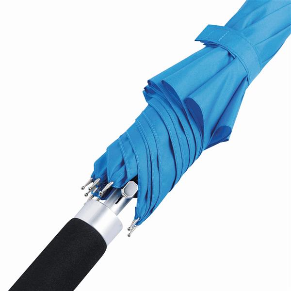 Automatyczny parasol RUMBA z aluminiową laską. Poszycie z poliestru pongee, szyny z włókna szklanego, aluminiowa laska, uchwyt z EVA. Materiał: Aluminium/Włókno szklane/Poliester Kolor: jasnoniebieski Tagi: parasole,parasole