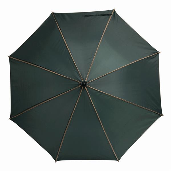 Automatyczny parasol WALTZ. Poszycie poliester 190 T, kontrastująca lamówka, czarne metalowe szyny, laska i uchwyt z drewna w kolorze orzecha włoskiego. Materiał: Drewno/Metal/Poliester Kolor: beżowy, ciemnozielony Tagi: parasole,parasole