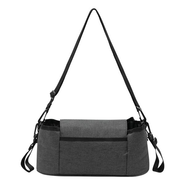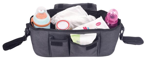 Torba do wózka BABY AID. Szybkie i łatwe mocowanie do wózka za pomocą odpinanych uchwytów na rzep, główna komora z 2 uchwytami na picie oraz komorą na zamek, 2 przednie kieszonki, regulowany i odpinany pasek na ramię.
