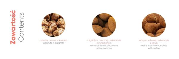 Chcesz w słodki sposób podziękować za udział w spotkaniu lub webinarze? Sprawdź Bakalie Słodkie Trio, czyli wyśmienity zestaw rodzynek w białej czekoladzie z dodatkiem kawy, migdałów w mlecznej czekoladzie i cynamonie oraz orzechów ziemnych w karmelu.