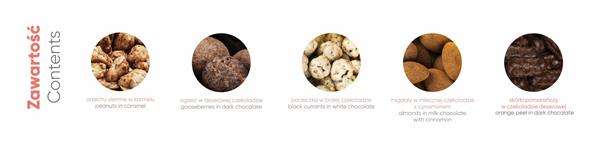 W stalowej puszce o dużej powierzchni reklamowej o wymiarach 300 x 110 x 35 mm ukryliśmy 5 rodzajów bakalii:
