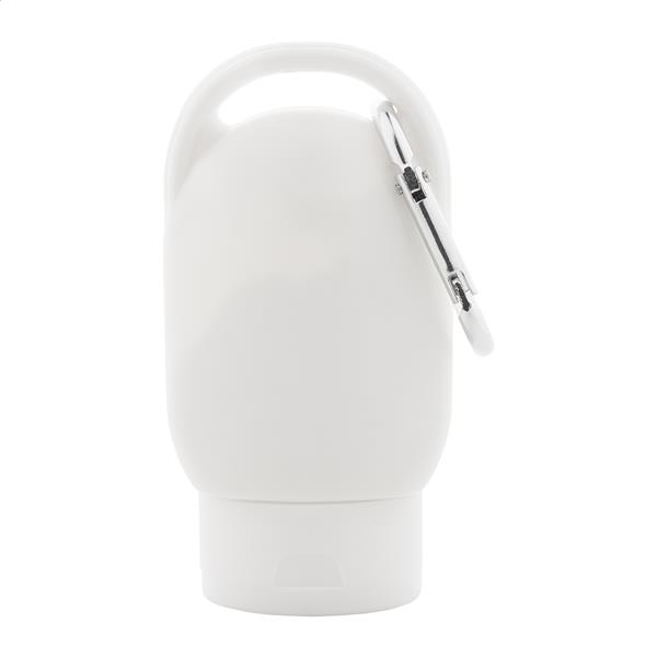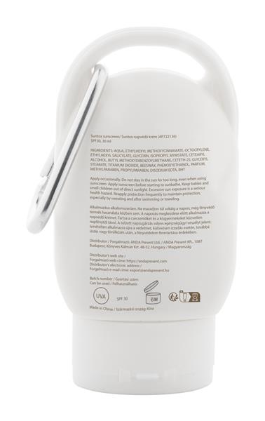 Balsam do opalania w plastikowym pojemniku z dopasowaną kolorystycznie nakrętką i karabińczykiem. Ochrona SPF30, 30 ml.