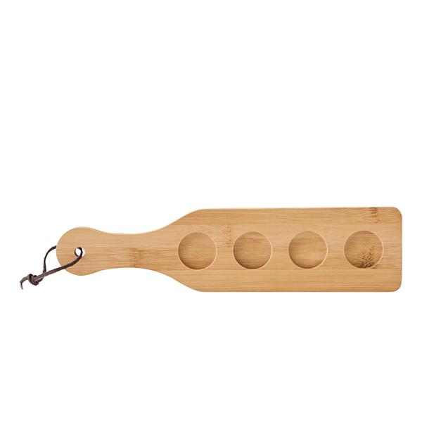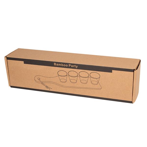 Taca z kieliszkami BAMBOO PARTY. Na bambusowej deseczce, w specjalnych zagłębieniach umieszczono 4 kieliszki (każdy po ok. 60 ml). Ze skórzaną pętelką do zawieszenia.