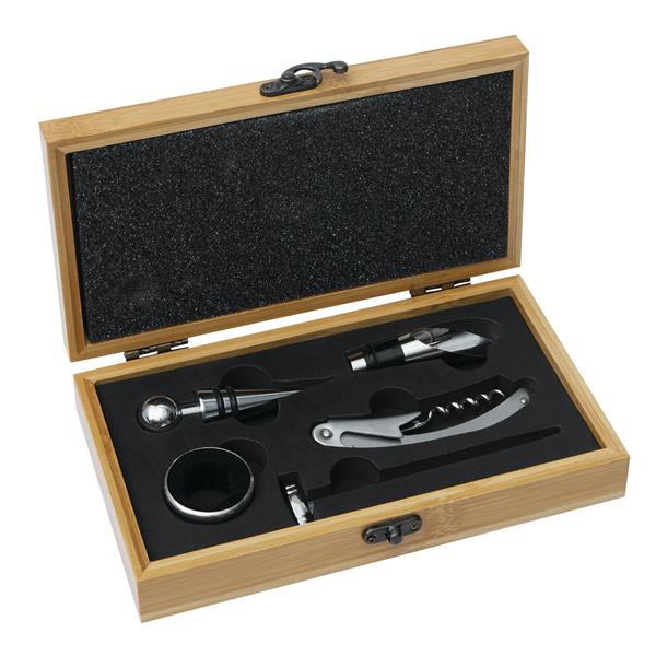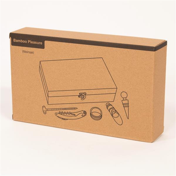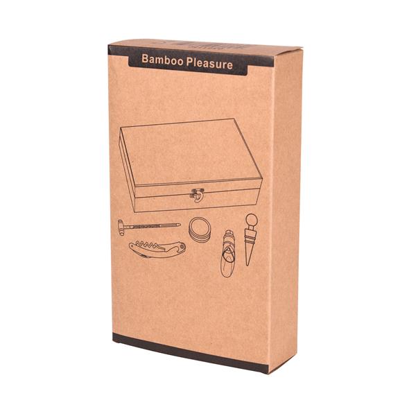 Zestaw do wina BAMBOOO PLEASURE w pudełku wykonanym z bambusa, ze szklanym termometrem, metalowym korkiem i nalewakiem, pierścieniem na szyjkę butelki i nożem kelnerskim. Tagi: Wino i akcesoria,przybory kuchenne,artykuły gospodarstwa domowego,zastawa barowa Kolor: brązowy, srebrny Materiał: Bambus/Stal nierdzewna/Stop cynkowy