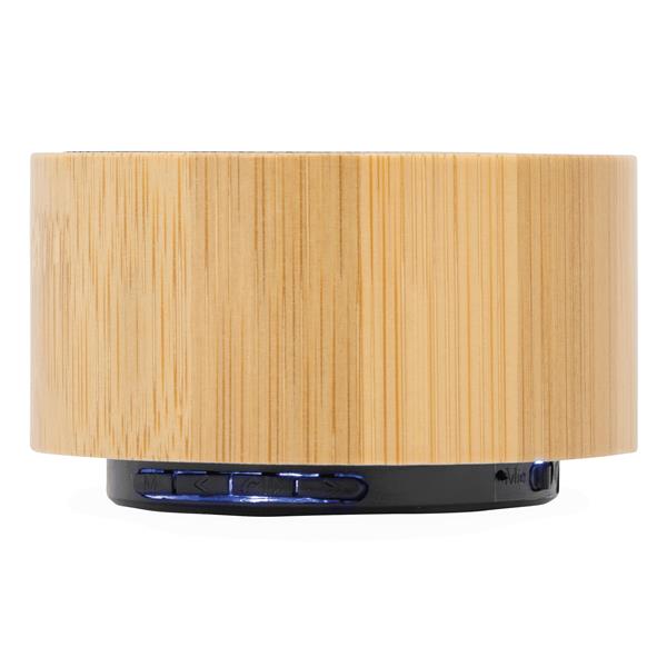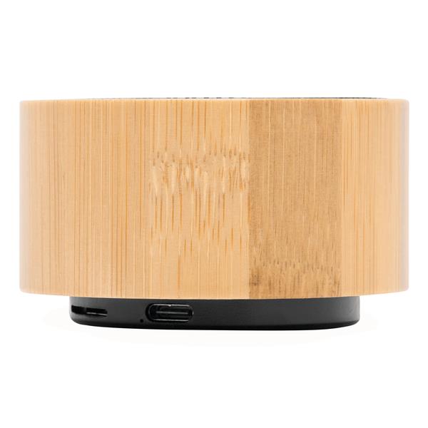 Głośnik bezprzewodowy BAMBOO SOUND z zewnątrz pokryty bambusem. Moc muzyczna 3 W, zasięg ok. 10 m, do parowania z telefonem komórkowym, odtwarzaczem MP3 lub tabletem. Gniazdo na karty microSD, funkcja głośnomówiąca, moc wejściowa 5V/0,5A, zintegrowany akumulator 300mAh, antypoślizgowa podstawa. W zestawie kabel ładujący USB typu C o długości ok. 50 cm.