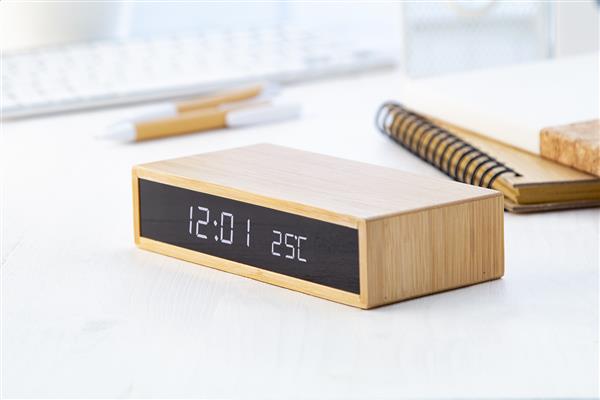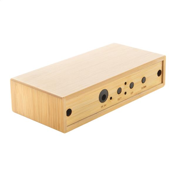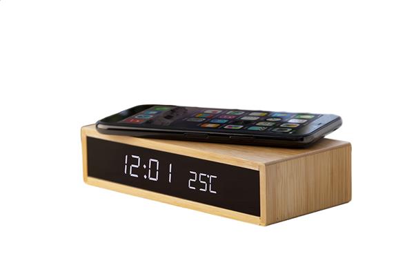 Wielofunkcyjny budzik w bambusowej obudowie z wyświetlaczem LED, termometrem i wbudowaną ładowarką indukcyjną (10W). W zestawie kabel do USB.