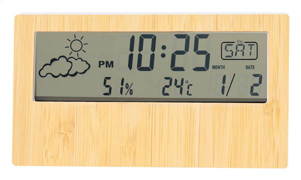 Cyfrowy zegar i stacja pogodowa z bambusa i tworzywa ABS, z termometrem i wskaźnikiem wilgotności. Działa na 2 baterie AAA, bez baterii.