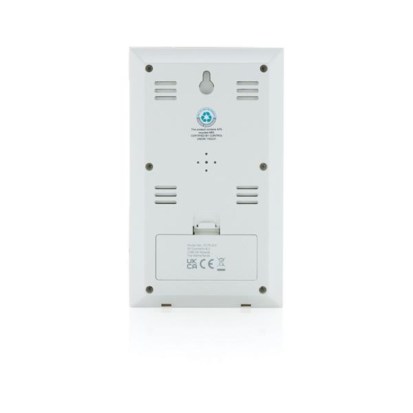 Stacja pogodowa, wykonana z certyfikowanego ABS z recyklingu oraz bambusa z certyfikatem FSC®, zawartość materiałów z recyklingu obliczona na podstawie wagi całkowitej przedmiotu: 42%, funkcje: temperatura, data, czas, wilgotnośc powietrza, baterie w komplecie, w pudełku kraftowym z certyfikatem FSC® mix, ślad węglowy produktu: 0,82 kg CO2