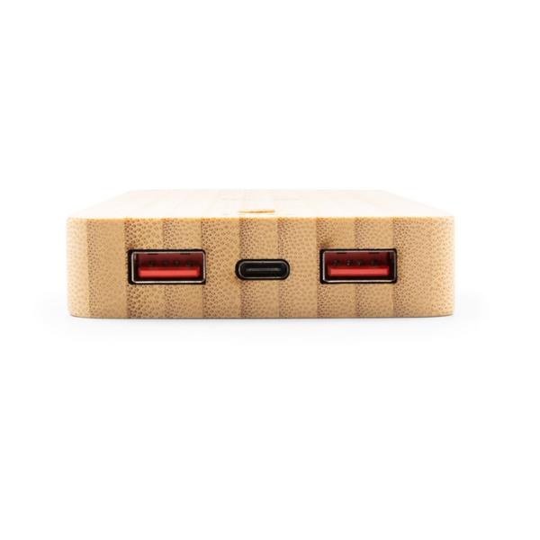 Bambusowy power bank B’RIGHT 8000 mAh, ładowarka bezprzewodowa 15W, działa z urządzeniami posiadającymi możliwość ładowania indukcyjnego, 5 diod wskazujących poziom naładowania, wejście USB-C, 2 wyjścia USB 18W, wyjście USB-C 19W, kabel USB-C w komplecie