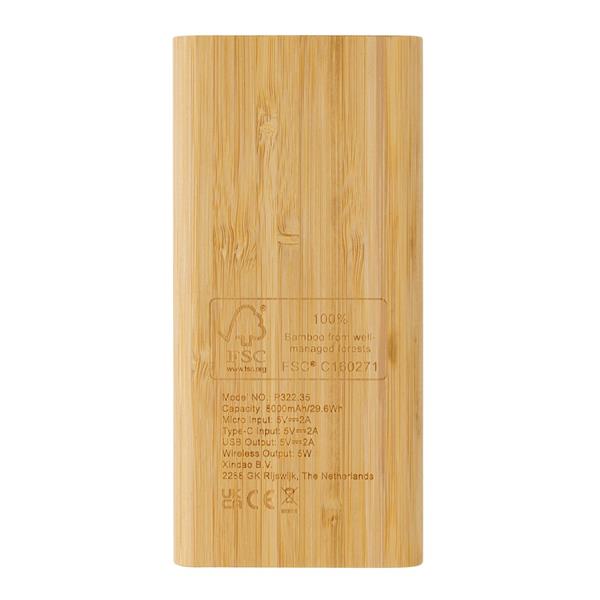 Power bank 8000 mAh, ładowarka bezprzewodowa 5W, 4 diody wskazujące poziom naładowania, obudowa wykonana z bambusa, wbudowany akumulator litowo-polimerowy klasy A, bezprzewodowe ładowanie jest kompatybilne ze wszystkimi urządzeniami posiadającymi możliwość ładowania indukcyjnego, wejścia micro USB i USB typu C 5V/2A, wyjścia USB i USB typu C 5V/2A, wyjście bezprzewodowe 5V/1A, kabel z TPE z recyklingu bez dodatku PVC w komplecie, nie zawiera PVC