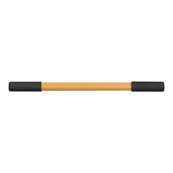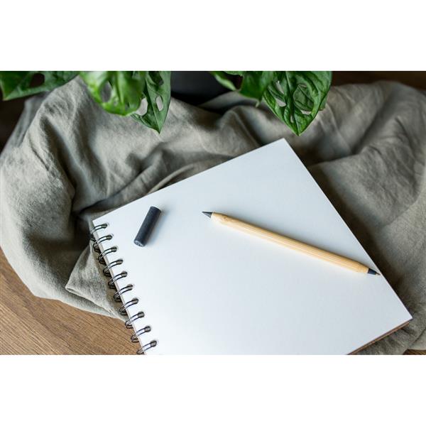 Długopis 2 w 1, „wieczny” ołówek, dzięki wykorzystaniu specjalnej wolnościerającej się końcówki długość pisania ołówka to około 1500 metrów, naostrzony, bambusowy trzon, dwie kolorowe zatyczki wykonane z papieru