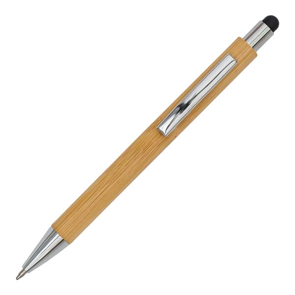 Bambusowy długopis z końcówką przystosowaną do ekranów dotykowych i latarka-brelok w upominkowym pudełku. Niebieski wkład. Minimalna wysokość litery przy znakowaniu laserowym to 3 mm