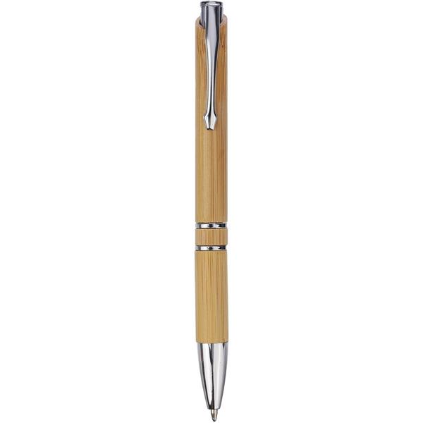 Długopis z chromowanymi detalami, klip ułatwiający zawieszanie na kieszeni albo okładce notatnika, wkład w czarnym kolorze, długość pisania ok. 800 m, produkt wykonany z bambusa, plastiku i metalu
