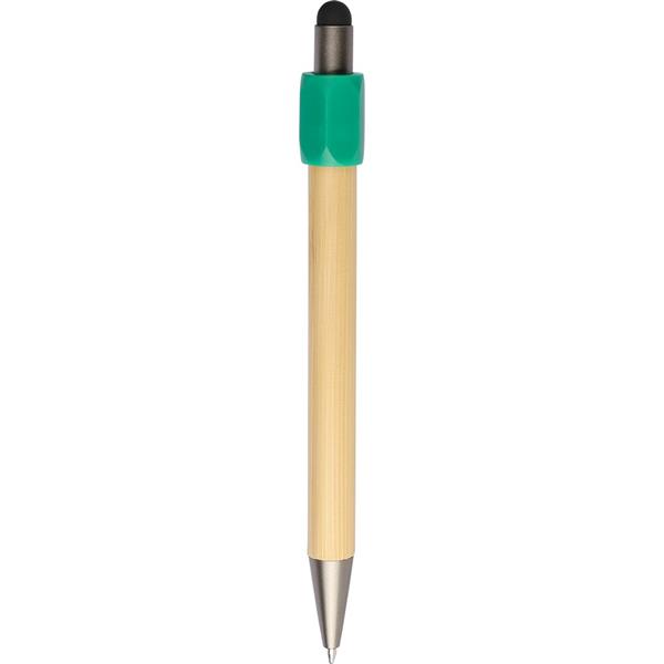 Bambusowy długopis z funkcją spinnera z ABS z recyklingu, czarna końcówka dotykowa na przycisku, wyposażony w mechanizm przyciskowy, wkład o grubości 1,0 mm oraz niebieski tusz o szacunkowej długości pisania 800 metrów, ikona ABS z recyklingu na produkcie