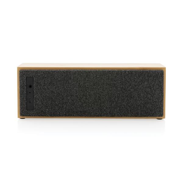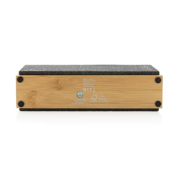 Głośnik bezprzewodowy 10W, BT 5.1 wykonany z bambusa i ABS z recyklingu, zawartość materiałów z recyklingu obliczona na podstawie wagi całkowitej przedmiotu: 23%, akumulator o pojemności 2000 mAh umożliwia odtwarzanie muzyki do 6 godzin, ponowne naładowanie w ciągu 2 godzin, zasięg do 10m, z funkcją odbioru i mikrofonem do odbierania połączeń (wideo), w pudełku kraftowym, kabel wykonany z TPE z recyklingu w komplecie.