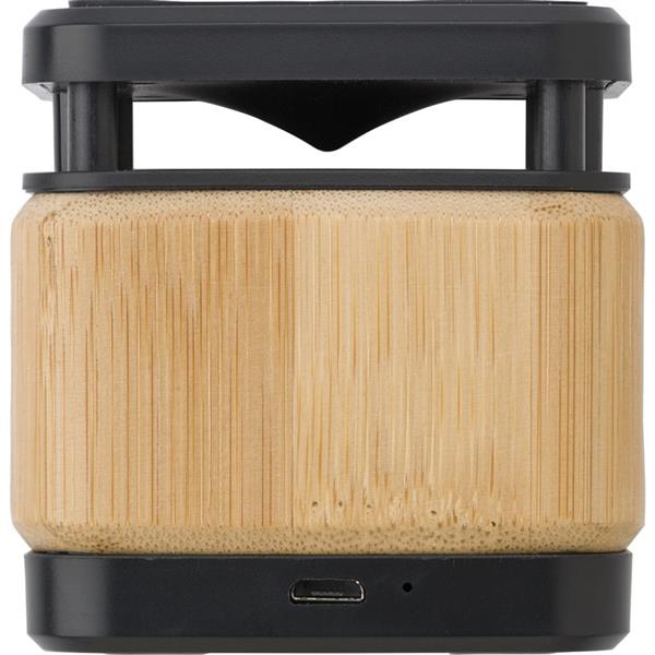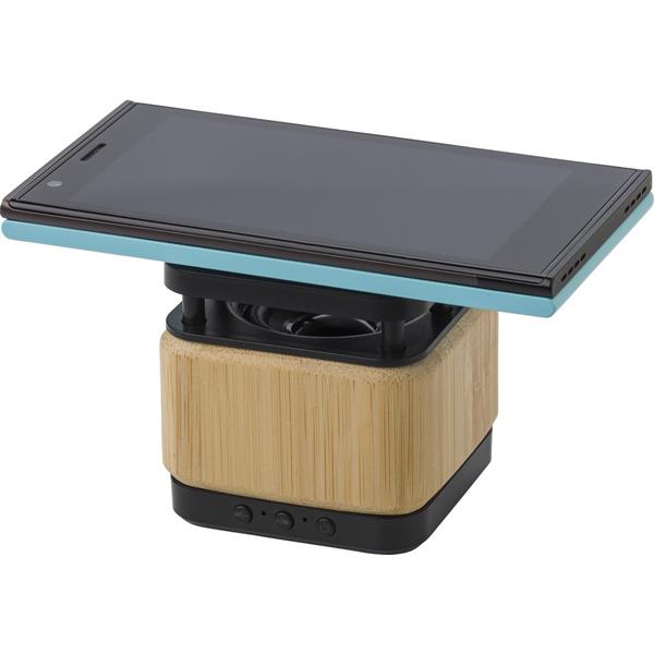 Głośnik bezprzewodowy BT 5.0 3W, zasięg do 10 m, ładowarka bezprzewodowa 3W, działa z telefonami posiadającymi możliwość ładowania indukcyjnego, bambusowa obudowa, wejście 5V/1.5A, wyjście bezprzewodowe 5V/0.8A, bateria 400 mAh, antypoślizgowy spód i góra, ładowany przez USB, kabel micro USB w komplecie