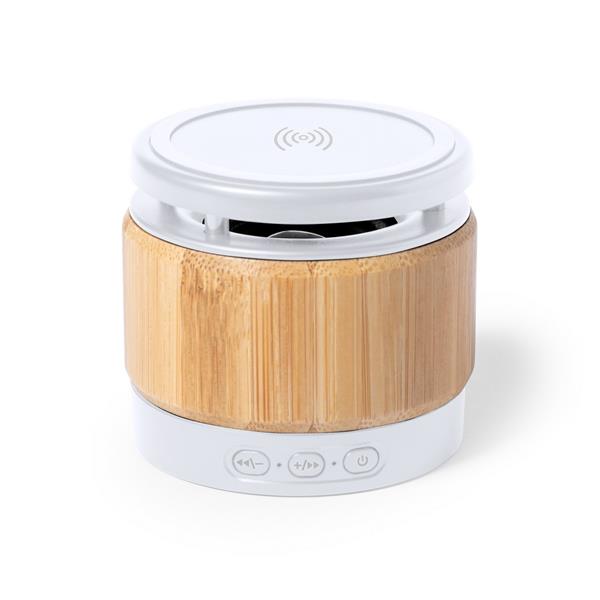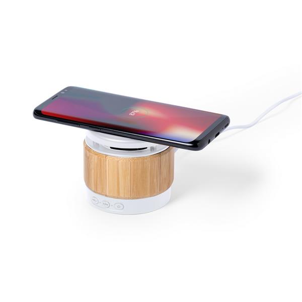 Głośnik bezprzewodowy BT 5.0 3W, ładowarka bezprzewodowa 5W, działa z telefonami posiadającymi możliwość ładowania indukcyjnego, bateria 400 mAh, bambusowy element na zewnątrz, zasięg do 10 m, wejście micro USB, ładowany przez USB, kabel micro USB 150cm w komplecie