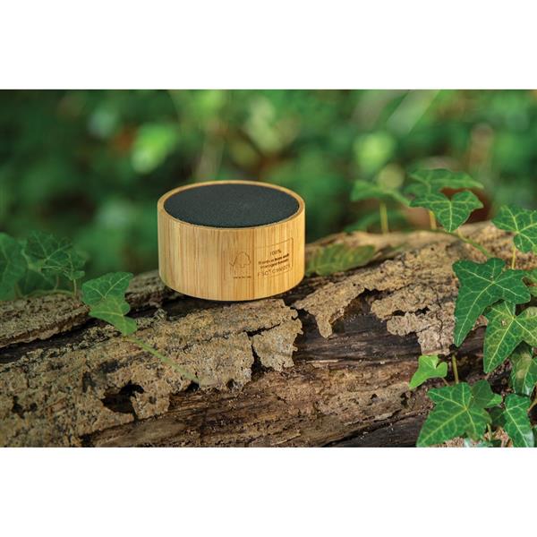 Głośnik bezprzewodowy 3W, BT 4.1 wykonany z bambusa i ABS z recyklingu, zawartość materiałów z recyklingu obliczona na podstawie wagi całkowitej przedmiotu: 16%, litowy akumulator o pojemności 300 mAh umożliwia odtwarzanie muzyki do 3 godzin, zasięg do 10m, z funkcją odbioru i mikrofonem do odbierania połączeń, w pudełku kraftowym, kabel wykonany z TPE bez dodatku PVC w komplecie