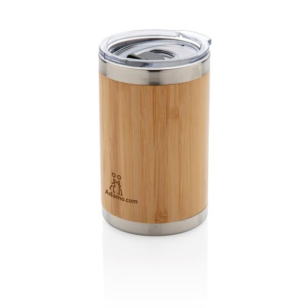 Bambusowy kubek termiczny 270 ml, wnętrze ze stali nierdzewnej 304 odpornej na rdzę i styczność z żywnością, powłoka z organicznego bambusa na zewnątrz, utrzymuje temperaturę ciepłych napojów do 3 godzin oraz zimnych do 6 godzin, pasuje do większości ekspresów do kawy, klasa termiczna: D
