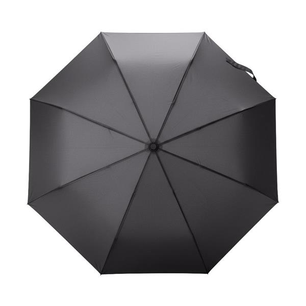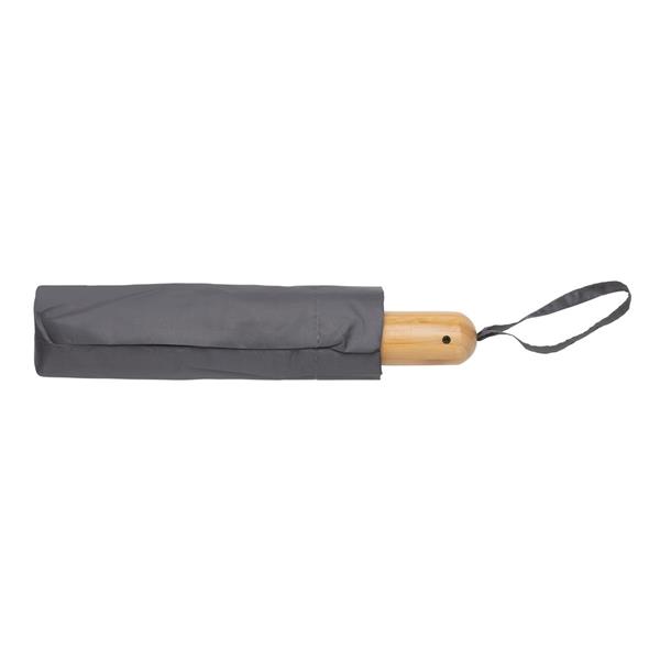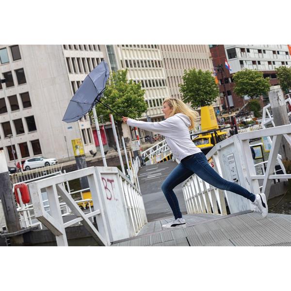 Parasol 21″ sztormowy, automatyczne otwieranie i zamykanie, metalowa rama, żebrowanie z włókna szklanego, bambusowy uchwyt, panele wykonane z 7,5 poddanych recyklingowi butelek PET (500 ml), dzięki zastosowaniu technologii fizycznych znaczników AWARE™ wykorzystane materiały są identyfikowalne z pochodzenia, 2% wpływów z każdego sprzedanego produktu z kolekcji Impact jest przekazywane na rzecz Water.org